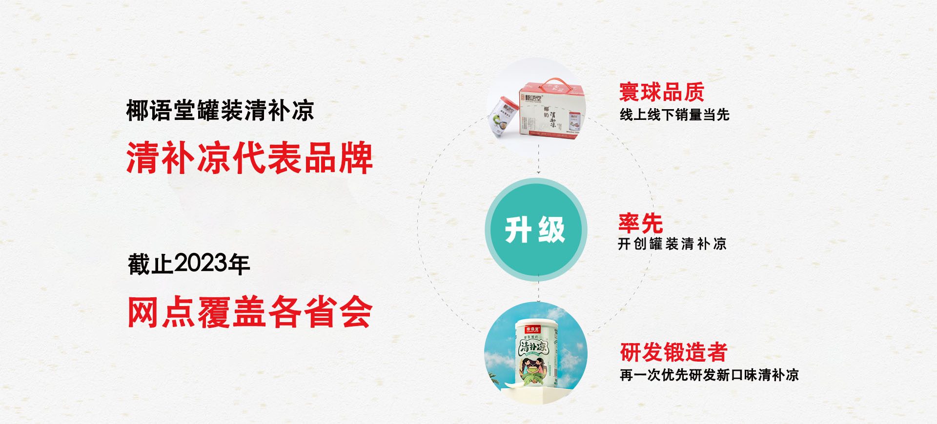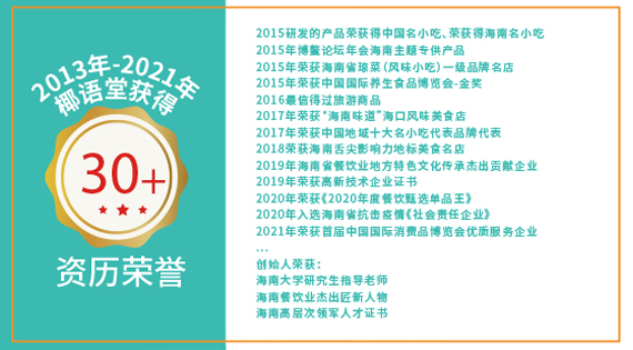 椰語(yǔ)堂始創(chuàng)于2012年,是海南一家把海南清補(bǔ)涼為代表的特色小吃精致化、標(biāo)準(zhǔn)化并進(jìn)行連鎖發(fā)展的企業(yè),椰語(yǔ)堂專注于海南本土地域特色元素特別是椰子系列產(chǎn)品的深度研發(fā)。椰語(yǔ)堂被評(píng)為海南風(fēng)味小吃一級(jí)品牌名店,椰語(yǔ)堂多款小吃被評(píng)為海南名小吃、中國(guó)名小吃,并被選為中國(guó)地域十大名小吃代表品牌。椰語(yǔ)堂的全國(guó)門店分布在各高端商場(chǎng)、機(jī)場(chǎng)、郵輪、五星級(jí)酒店、動(dòng)車站、景區(qū)等。椰語(yǔ)堂清補(bǔ)涼被選為博鰲亞洲論壇專供產(chǎn)品、中國(guó)國(guó)際養(yǎng)生食品博覽會(huì)金獎(jiǎng)等殊榮,椰語(yǔ)堂清補(bǔ)涼在線下各連鎖賣場(chǎng)、盒馬鮮生、中石化易捷、中石油昆侖、全國(guó)30多家機(jī)場(chǎng)、五星、七星酒店等渠道銷售并成為政府及集團(tuán)采購(gòu)產(chǎn)品。在電商線上渠道,椰語(yǔ)堂椰奶清補(bǔ)涼無(wú)論在銷量和好評(píng)方面是品類第一,是深受消費(fèi)者喜愛的高品質(zhì)產(chǎn)品。椰語(yǔ)堂是海南大學(xué)食品學(xué)院研究生實(shí)習(xí)基地,公司發(fā)揮椰語(yǔ)堂研究院優(yōu)勢(shì),擁有產(chǎn)品研發(fā)方面的多項(xiàng)專利。椰語(yǔ)堂因?yàn)槠鋬?yōu)秀品質(zhì)及良好顧客體驗(yàn),被中央電視臺(tái)、湖南衛(wèi)視、旅游衛(wèi)視等多家衛(wèi)視、人民日?qǐng)?bào)、中國(guó)縣域經(jīng)濟(jì)報(bào)、新浪、騰訊、SSBD等國(guó)內(nèi)外媒體報(bào)道宣揚(yáng)。椰語(yǔ)堂是海南文化的傳播和弘揚(yáng)者,是海南地標(biāo)美食品牌的優(yōu)秀代表和海南地域文化的一張亮麗名片,同時(shí),椰語(yǔ)堂也是中國(guó)連鎖經(jīng)營(yíng)協(xié)會(huì)會(huì)員單位。